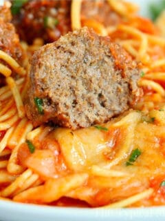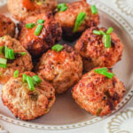 Remove from the oven and drizzle with buffalo sauce, or make Alfredo Meatballs with this creamy sauce. Gently toss the meatballs or just serve the meatballs as is with toothpicks. Then you can offer a bunch of different options for guests to make a few different types. This is a fun one especially during a big get together like Super Bowl.
