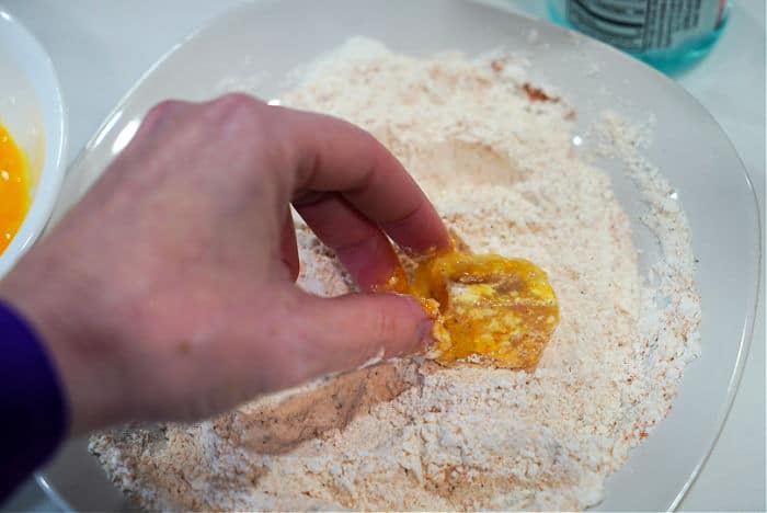 I just used flour and egg as a coating for this. You could alternatively use a bagged fish breading mix of sorts and go that direction too. I’m sure the timing would be the same as ours using that on the outside.