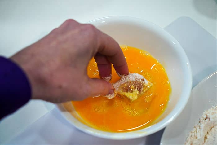 - One at a time coat fish piece in flour mixture, then dip and coat with egg (allow excess to drip off), and then coat again with flour mixture.
