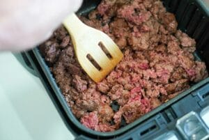 - Break up ground beef and lay in air fryer basket without overlapping.