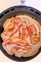 You’ve likely made air fryer bacon before when you first got your machine right? We did too, so easy and love how the grease drains away as it crisps. This takes a few more minutes as you add a sweetness that can be compared to no other. For Ninja Foodi recipes you can do this too with the lid that is attached and the basket with the holes on the bottom.