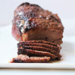 Do not overcook this, it should be 135 degrees F inside. When it’s done and resting the temp. it will continue to increase 5-10 degrees so keep that in mind when taking the internal meat temperature. AND allow it to rest for at least 15 minutes, covered, before slicing and serving. If not you’ll release the juices and dry it out.