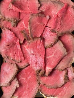 You are looking at about 30 minutes depending on the weight and thickness of your piece of meat. Check often with a thermometer to get it to the ideal internal temperature of 135F by opening the basket. You may have tried our Instant Pot roast beef but this has an added layer of YUM on the outside and it gets crispy too. Just season, air fry, rest and slice thin to enjoy!