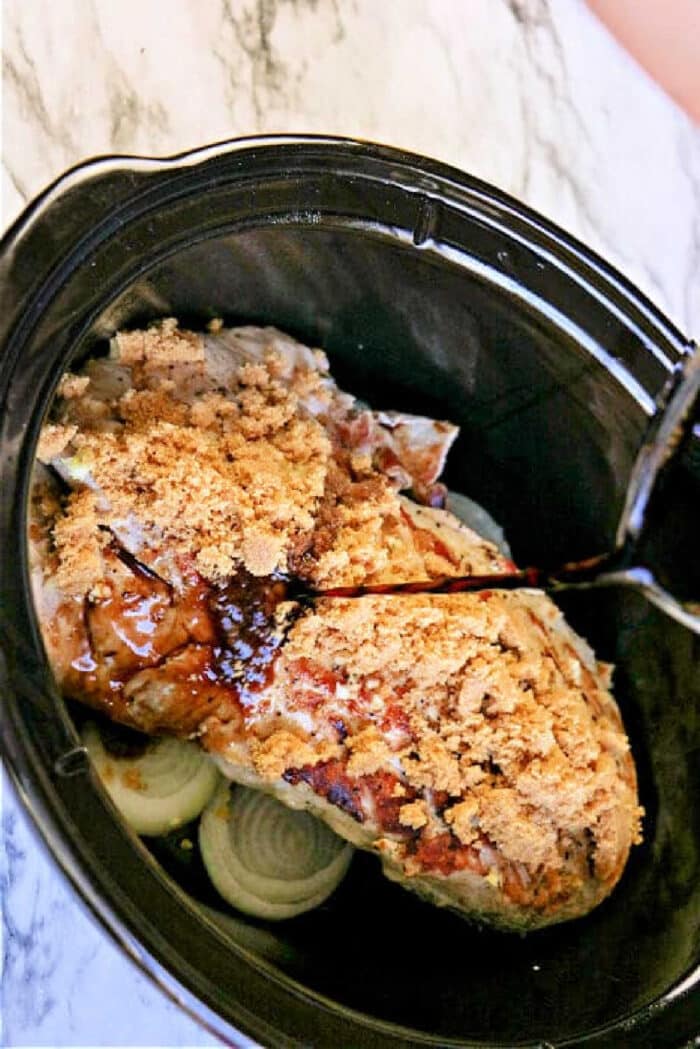 Yes, just whisk together with garlic, balsamic, sugar, broth and soy sauce to make a sort of marinade to pour over the top. There will be a bit of liquid that is in the slow cooker once it starts to cook and that liquid is tasty to eat!