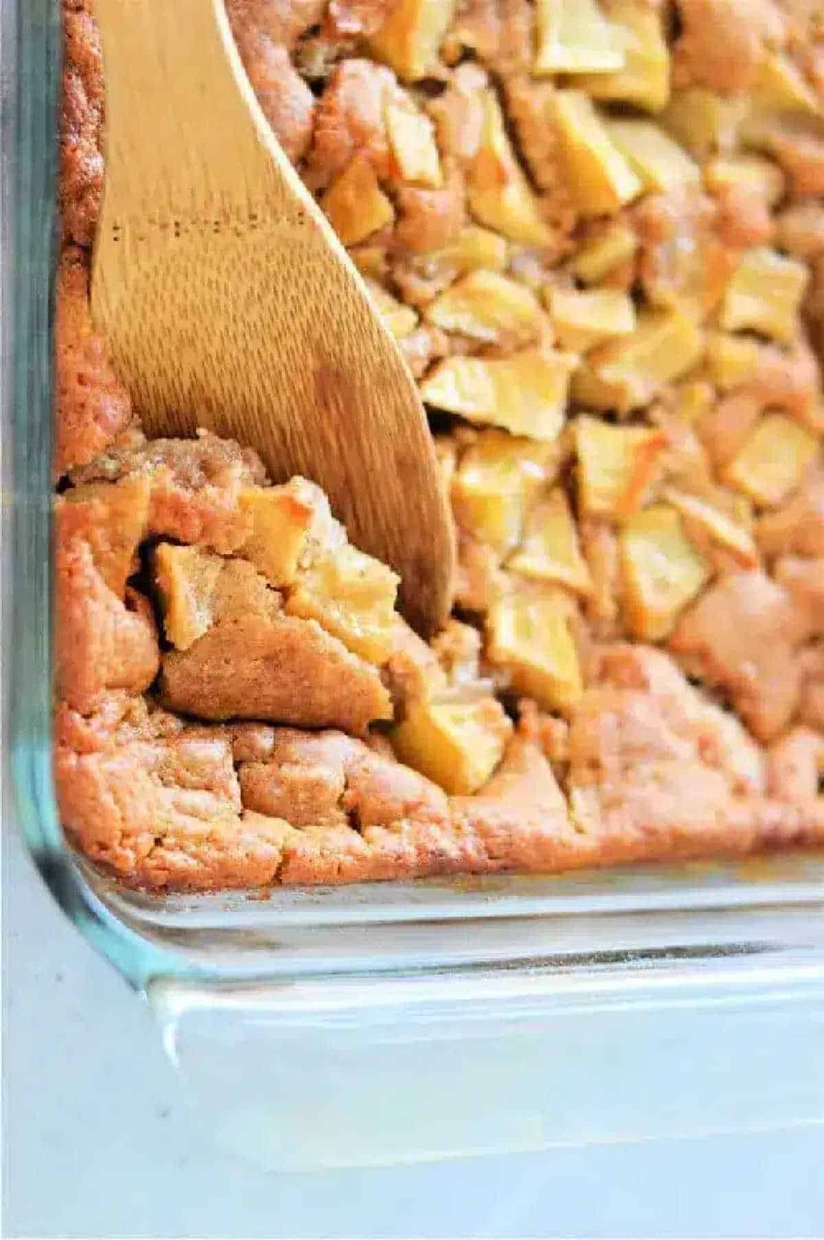 - Stir in the cinnamon. Pour the batter into an 8×8 (or 9×9) baking dish, top with your apple/sugar mixture.