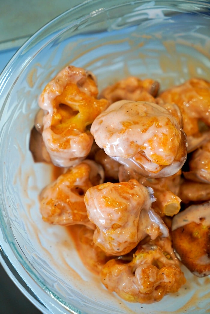 We like to have a vegetable side dish for dinner each night but traditional steamed veggies get a bit boring. It looks delicious right??!! This twist on buffalo wings turned into these bites that are actually amazing. Make it as spicy or toned down as you desire.