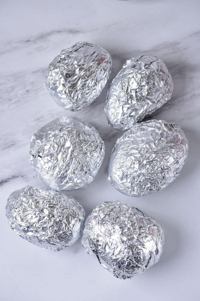 Whether you bake these babies or make air fryer baked potatoes you always want to keep the skins moist with something that will help them crisp too. Olive oil does the trick for that. Now if you stick them in as is without something covering them the outsides will get quite “done” before the inside becomes tender to your liking.