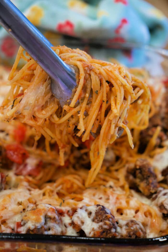 Our easy baked spaghetti with meatballs recipe (no boil) cooked in one pan is delicious. Made with a jar of spaghetti sauce, noodles and homemade or frozen meatballs, your whole family is going to love this topped with mozzarella.