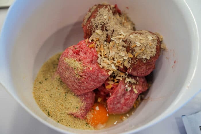 - Preheat your oven to 375F. Mix together ground beef, egg, onion soup mix and breadcrumbs together to make homemade meatball mixture. Use small cookie scoop to scoop up mixture and roll into balls.