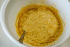 This is super easy to throw together. I like to mash the bananas first in the large bowl where I will add the other wet ingredients into. I do not like to use a mixer as I think it creams the fruit too much and I prefer to have some larger chunks here and there inside. I think it makes it overall more moist but just my opinion.