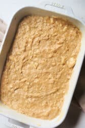 - Mix in dry ingredients. You want the batter to be think but spreadable. Grease a 9×13 pan and add in the batter.