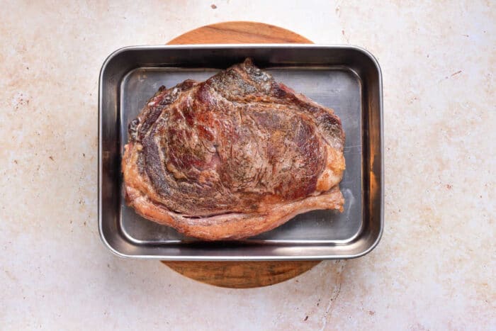 - When done, remove from oven, lift meat out of pan and into a piece of foil, wrap up and leave to rest, wrapped, for 10 minutes. At this time the temperature inside the steak will rise about 5 degrees more and lock in the moisture so it is as tender as possible.