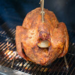 Make sure you remove your bird from the heat source before determining it’s proper temperature. If it isn’t done through then put it back on and give it more time until it’s ready. Last but not least we used this Turkey Dunrite apparatus which is the best way to keep it as moist as possible.