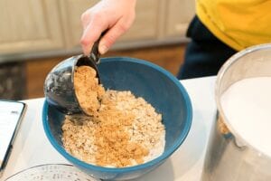 - In another bowl combine your 1.5 c of all purpose flour with brown sugar, and old fashioned oats. Stir together.