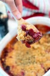 Either one is great but this is made with fresh tart cherries. They are just called different things depending on whom you ask really. Tart cherries are sour and often used as key ingredient in desserts such as homemade cherry pie. Of course with any fruit crisp you need a sweet topping like with oats for texture and flavor, or dough like our Easy Cherry Cobbler.