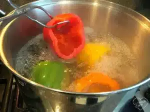 - Remove the top and core from each bell pepper and empty of all membranes and seeds. When the water is boiling submerge all hollowed out peppers into the water to blanch them (soften and take away some bitterness). This should take about 5 minutes to slightly soften and then take out and set inside your baking dish with holes facing up.