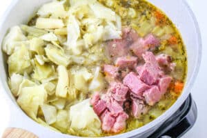 If you wanted to make a thicker sauce for this Cabbage Stew you could certainly whisk some cornstarch into heavy whipping cream and fold that in when you add the meat. We are going for a healthy soup this go around with just the flavors of the vegetables and proteins.