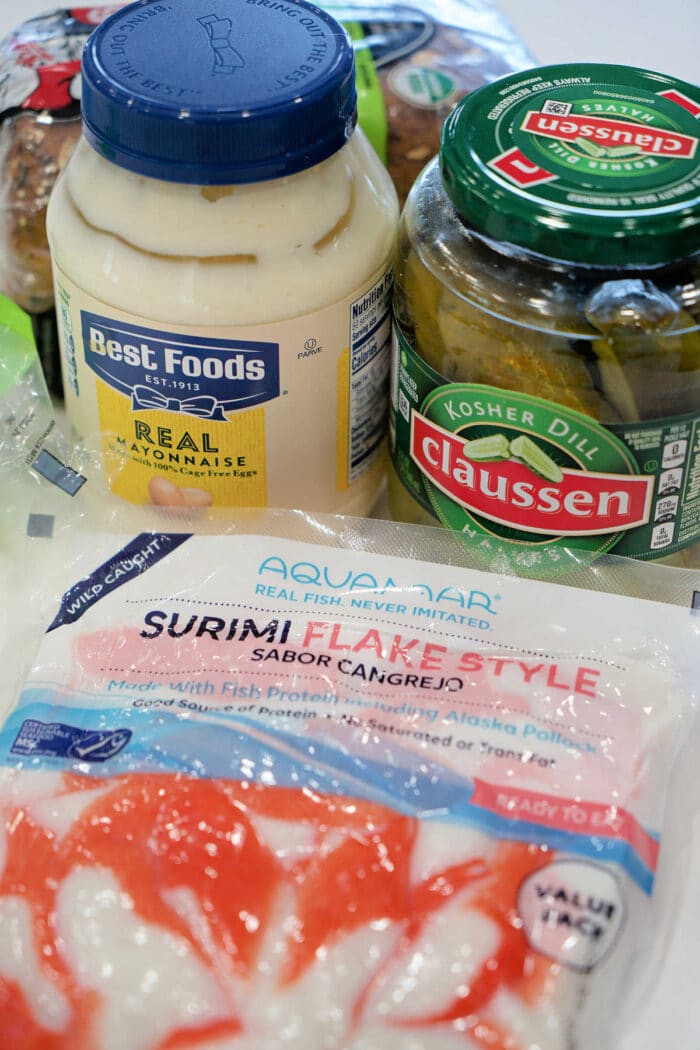 Our easy crab salad sandwich recipe only needs 3 ingredients to become a delicious high protein lunch! Made with imitation crab, pickles and mayonnaise you can make in just 10 minutes to serve on bread or with crackers.