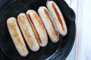I have experimented with how to cook frozen bratwurst a few different ways. Frozen Brats in Air Fryer actually turn out quite well, faster than this and you don’t have to use a pan first. This way though the HOT air does all the work for you. Gets ’em tender inside and with a big SNAP on the casing.