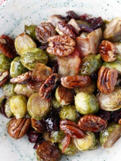 If you want them crispy like our baked brussels sprouts at 450 you would want to pour on to a sheet pan and broil for a few minutes until golden brown on the tops. If you want a duo, and one that is cold to choose from, make a bowl full of our shredded brussel sprout salad to serve together.