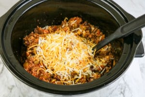 - Add all other ingredients EXCEPT cheese. Stir together, close lid and cook 3 hours on high or 6 hours on low heat.