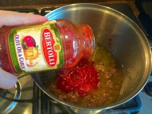 Yes. If you want to add ground beef and/or onions and garlic do so first. You want meat to be browned and add-ins softened for the ideal texture. Spicy Italian sausage is a great choice if you want it a bit spicy.