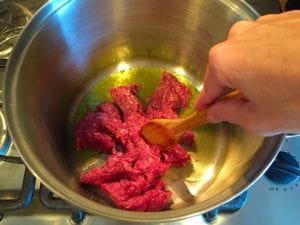- Brown your ground beef/or turkey in your one pot with a bit of olive oil. Add 1/2 cup diced onion and 2 tbsp minced garlic (both optional) in about halfway thru until tender.