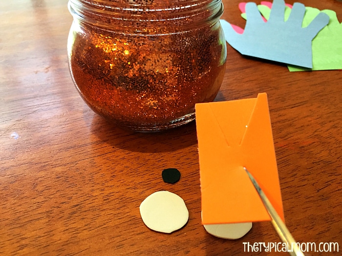 Pour glitter inside the jar and shake it all around so the entire inside is covered with glitter and it is sticking to the sides, then pour out excess glitter. Now trace and cut out about 4 hand prints out of construction paper, and eyes out of the sticky back foam pieces.