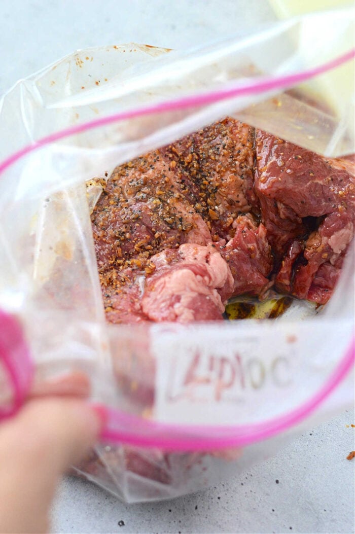There are many choices when it comes to marinating but we have a simple combination you can make below. If you have one you swear by then by all means go that direction. OR you can use what you see above that we use as the best fajita marinade but works for larger cuts as well. You want to get out a gallon freezer bag and combine the following ingredients, lay inside coated, press out the air and seal closed. Set in the fridge for at least 2 hours – 24 hours ideally before cooking.