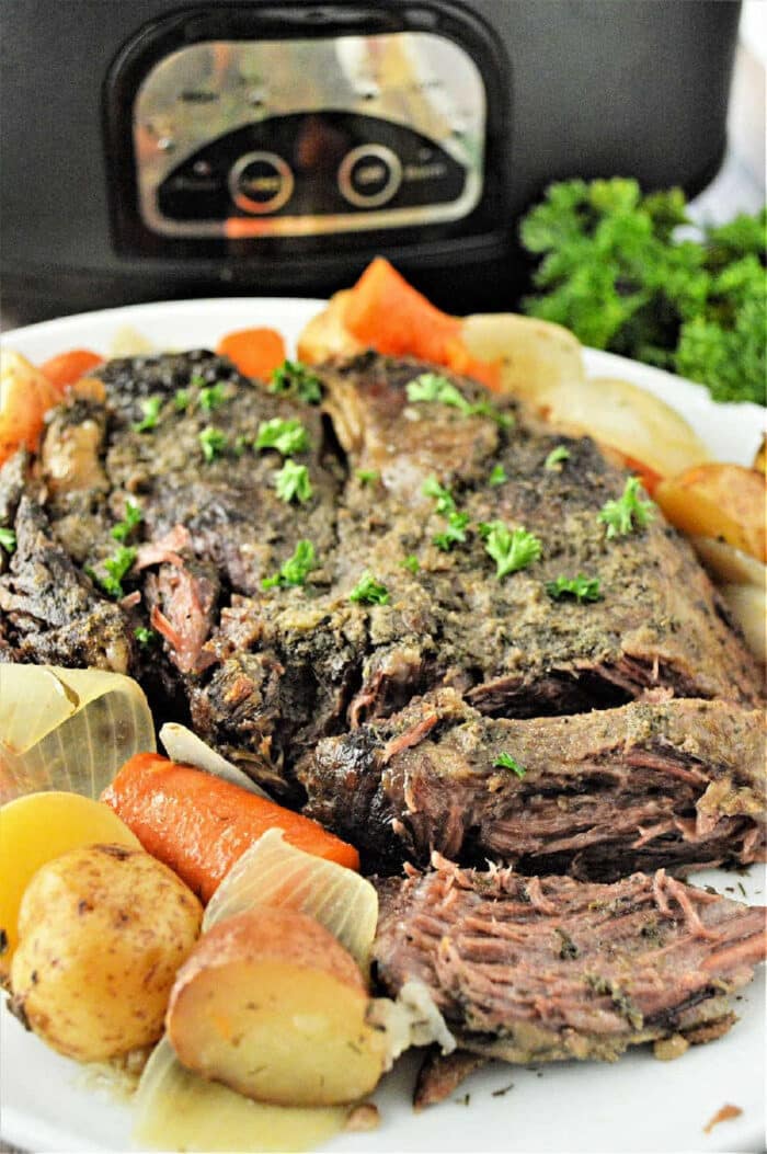Easy frozen roast in slow cooker directions are here! If you forgot to defrost your chuck roast for dinner, it’s no problem. Use your Crockpot with our step by step directions here to make melt-in-your-mouth delicious beef with vegetables too.
