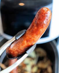 Since these are precooked you’re pretty safe but if you were cooking raw frozen sausage in air fryer you’d need to increase total time to 14-16 minutes and use a meat thermometer to ensure they’re cooked to a safe 160 degrees internal meat temperature. Raw pork recipes need to be fully cooked before consuming to be safe.