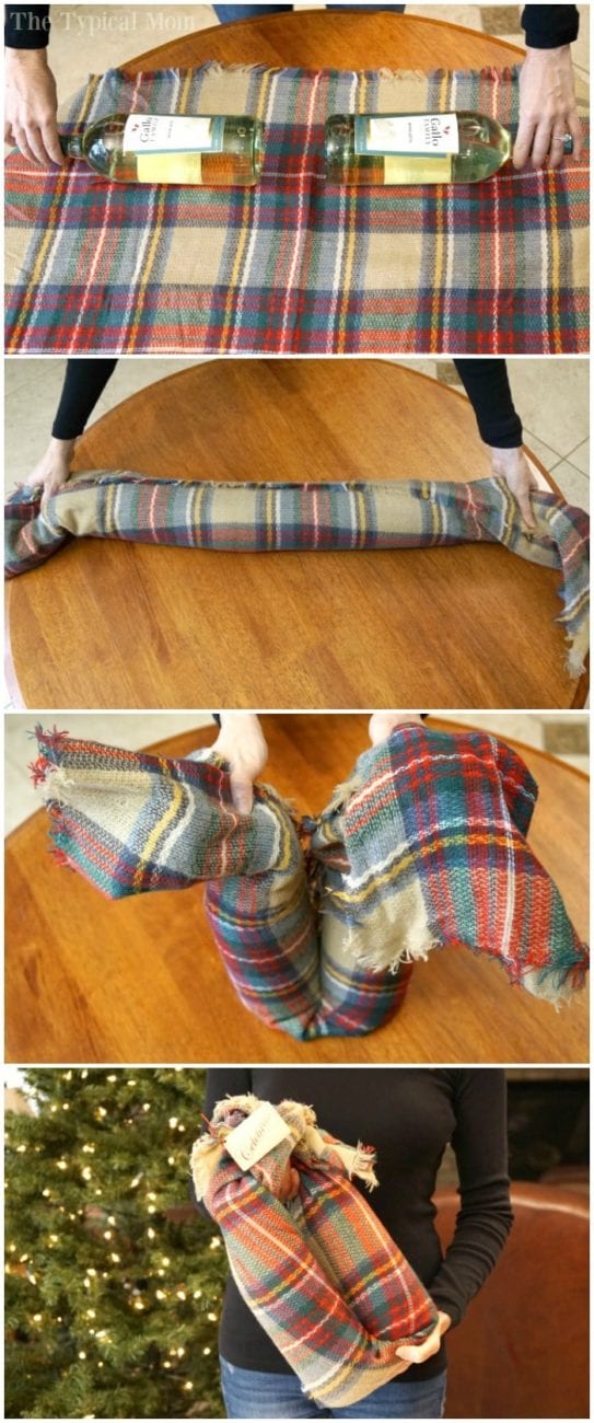 How to gift wine bottles in a scarf makes this a fun and useful wine gift idea! Step by step instructions and video of how to wrap 2 bottles in a scarf to create a unique gift.