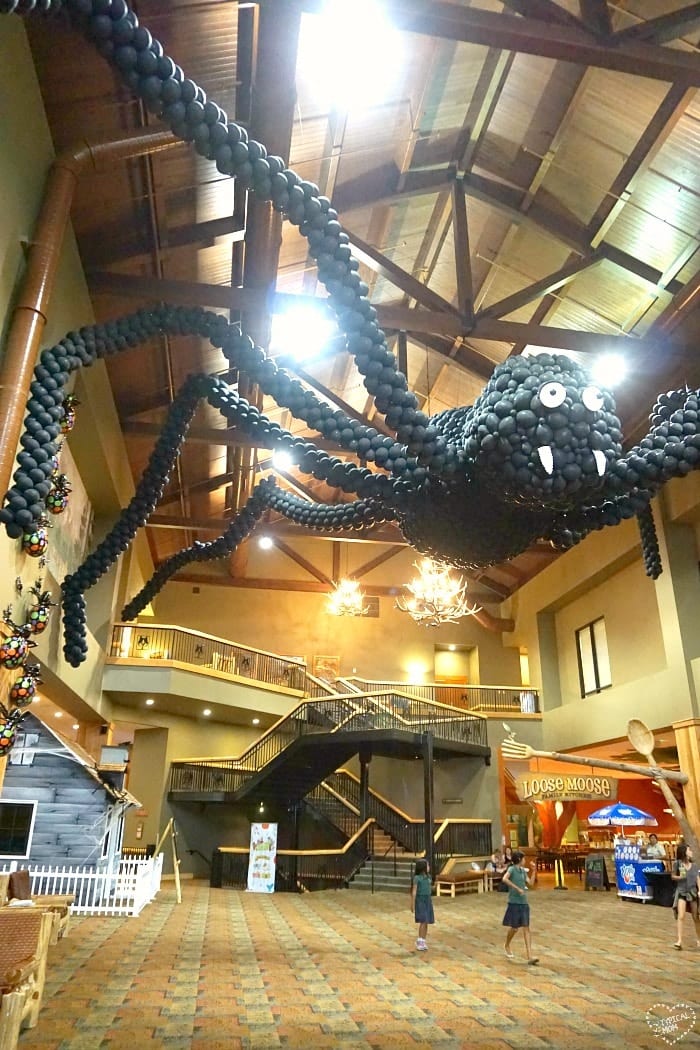 The lobby is transformed into a Halloween themed area complete with a HUGE spider atop the ceiling made entirely of balloons and a haunted house you can actually dine in!!