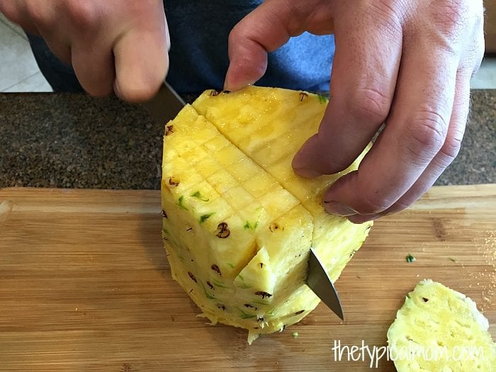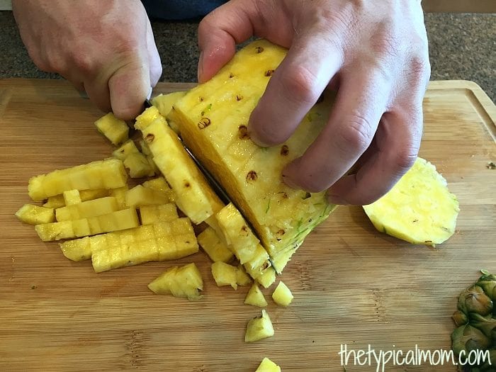 Cut it into bite-sized pieces for easy eating. You can drain a can that is already sliced or this is how to cut a pineapple into diced pieces.