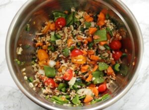 - Pre heat the grill to medium high. Combine the cooked rice with the vegetables, seasonings, pinch of salt & pepper and a drizzle of olive oil.