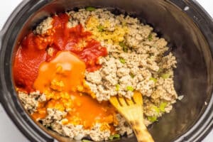 - Add this ground chicken mixture to your slow cooker. Add your salt, pepper, tomato sauce, buffalo wing sauce, honey and worcestershire sauce. Stir everything to combine. Cover and cook on low for 4-6 hours just for flavors to deepen.