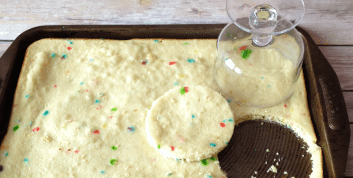 - Once cake has cooled, gently cut cake into one inch pieces.