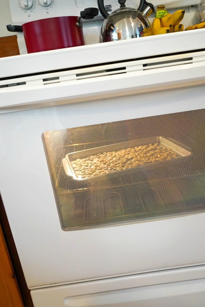 About 3 cups of seeds fit on my cookie sheet at a time without overlapping. This is important because if they’re on top of one another they won’t get really crispy.