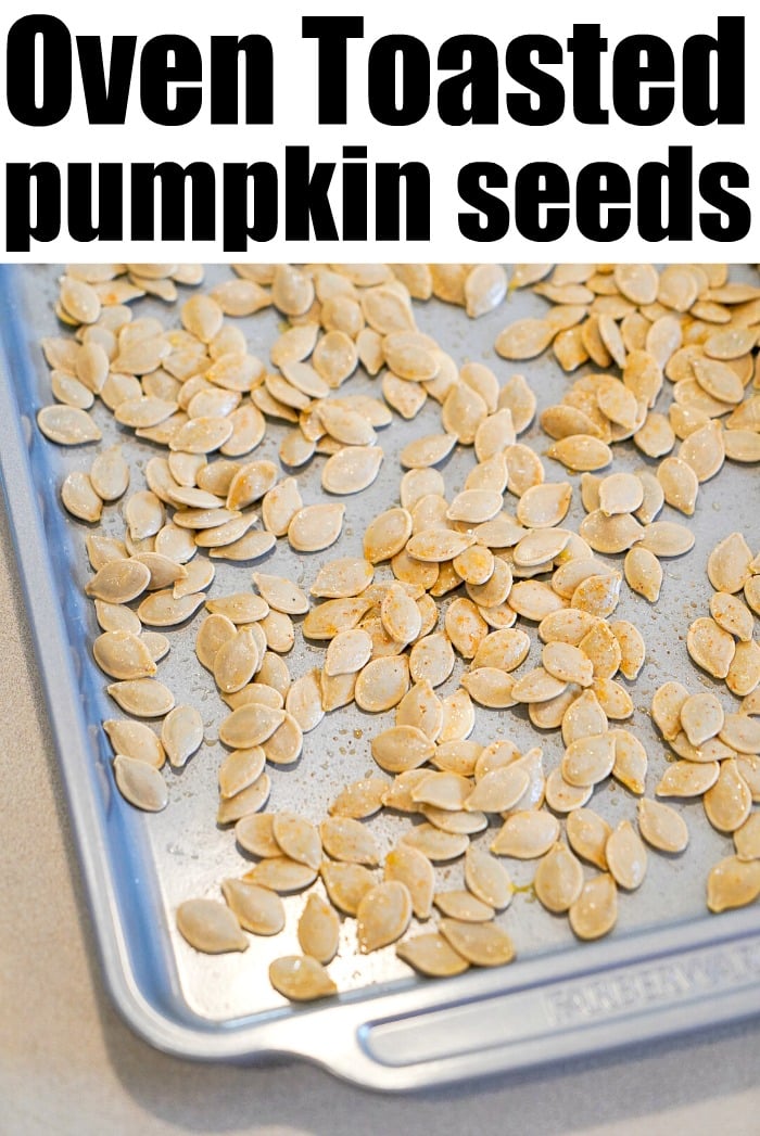 How long to bake pumpkin seeds in oven is answered. Roasted homemade and crispy, these are the best snacks made like roasted spaghetti squash seeds but better!! If you’ve been throwing these out when carving please don’t! You’re missing the best part and I bet your kiddos will love this snack too. (affiliate links present)