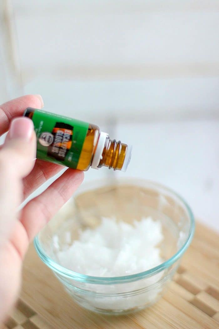 - Scoop 1 cup of room temperature coconut oil into a mixing bowl. Add 20 drops of eucalyptus oil and 10 drops of peppermint essential oil into the bowl.