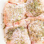 - Season both sides of the chicken thighs with salt, pepper, garlic powder, and paprika. (and any other seasonings you desire).