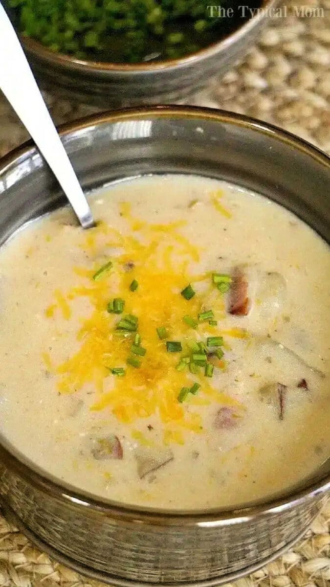 Totally loaded potato soup is a good name for it since we pack it with extras like lots of bacon, diced onions and chives. You can make as a Ninja Foodi recipe, in a Crockpot Express or other brand of pot to make this too.