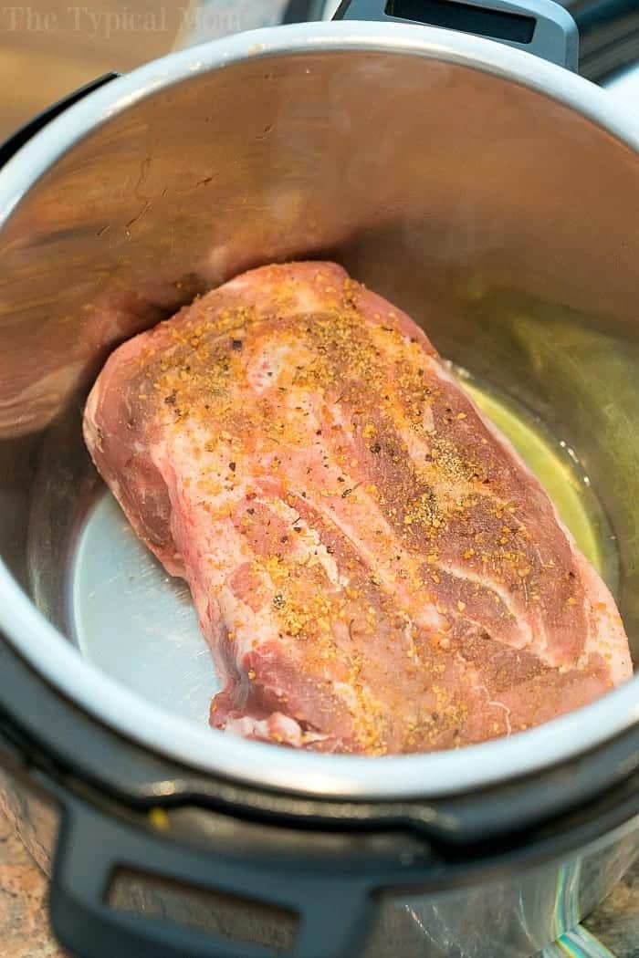 - Set Instant Pot to saute and add olive oil. Rub seasoned salt and roasted garlic and herbs on pork roast on both sides. When hot add pork roast and sear on both sides, turn Instant Pot off.