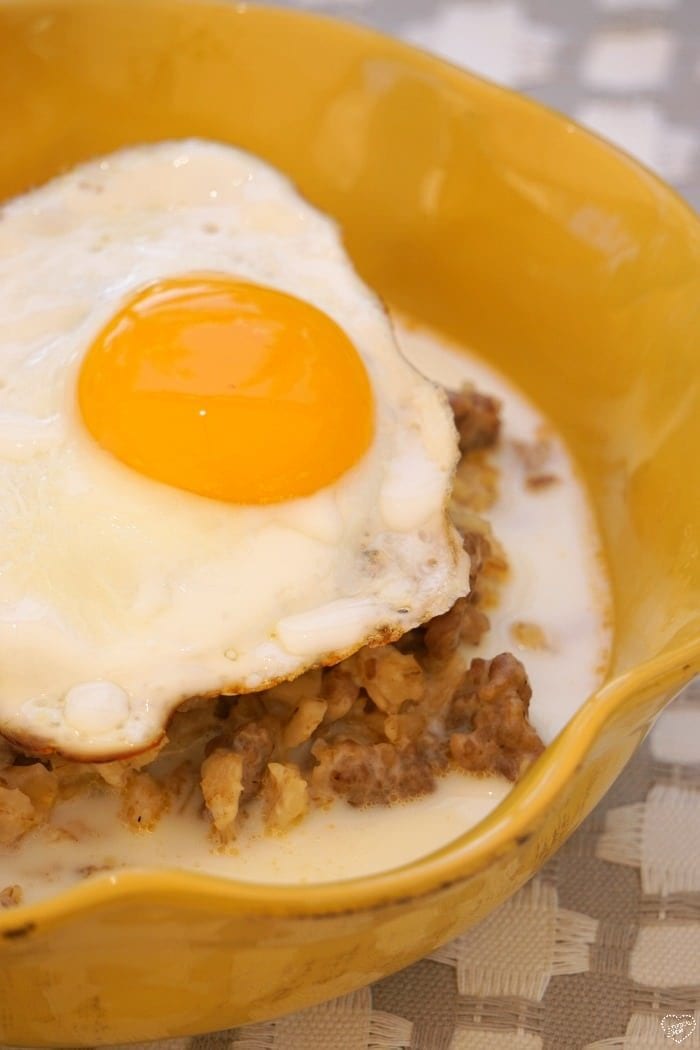 - Cook an egg medium / hard and place on top. Pour extra milk on top if desired.