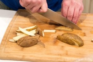 - Wash, dry, and slice potatoes into strips (like french fries), leave skins on. Lay them on paper towels and wrap up so you remove as much moisture on the outside as possible.
