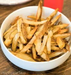 You can (but they aren’t as good as these). For those instructions you would follow our frozen french fries air fryer steps. I will say that this method is by far better than in the oven though y’all. Overall cook time will vary depending on how thick your potato slices are. Check the last few minutes until they’re golden brown to your liking. Then serve with fry sauce!!