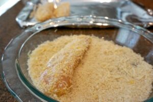 I like using lighter Panko bread crumbs for this. You could use Italian but that creates a more dense coating that isn’t quite as crunchy and has more calories too. In that small bowl combine in some Parmesan cheese too for flavor and added texture. This is of course optional but a really nice touch to the dish overall.