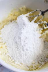 - Then, in a bowl beat together softened cream cheese and butter for about a minute with a mixer until smooth. Add in the powdered sugar, vanilla and cooled (but not hardened) white chocolate and mix until thoroughly combined and thick.