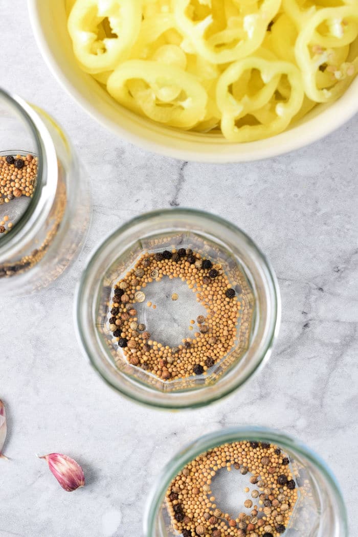 - Sterilize canning jars in advance with boiling water or hot steam. If you don't plan on storing for a long time, you can skip this step. In this case, store in the refrigerator once jars are filled. Arrange mustard seeds, peppercorns and coriander seeds in jars.
