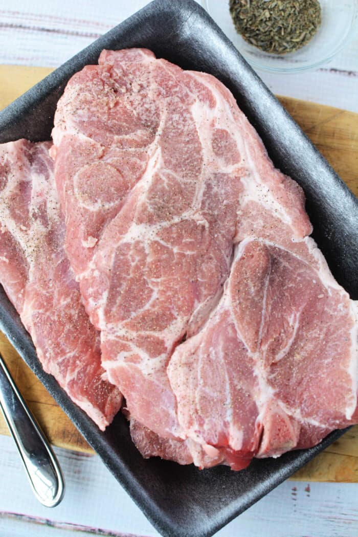 What cut of meat is a pork steak? These are cuts of that come from the shoulder of the pig (specifically the upper portion of the shoulder, near the neck). This area is also where Boston butt or pork shoulder roast comes from. They are also called blade steaks or Boston butt steaks are. Let’s get into how to cook them perfectly. (post may contain affiliate links)